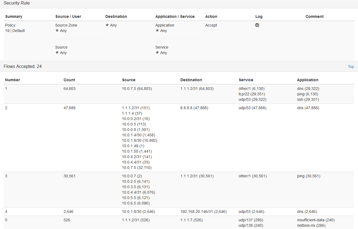 Ðí¶à·À»ðǽÉϾù»á´æÔÚһЩ¹ýÓÚ¡°¿íËÉ¡±µÄÇå¾²Õ½ÂÔ£¬°üÂÞÔÊÐíÁ˹ý¶àµÄIPµØÖ·¡¢ÔÊÐíÁ˹ý¶àµÄ·þÎñ¶Ë¿Ú£¬»òÕßÖ±½ÓÊÇ¡¯any¡¯ÀàÐ͵ÄÇå¾²Õ½ÂÔ¡£Õâ²»ÇкÏÇå¾²Õ½ÂÔÉèÖõÄÒ»banÐÔÔÔò£¬ÐèÒª¾ÙÐС°ÊÕÁ²¡±¡£Í¨¹ýFiremon²úÎïµÄTraffic Flow Analysis¹¦Ð§£¬ÖÎÀíyuan¿ÉÉó²éÈκÎÒ»ÌõÇå¾²Õ½ÂÔµÄÁ÷Á¿ÏêϸÐÅÏ¢£¬°üÂÞÖÖÖÖÓ¦ÓõÄÖÀÖÐciÊýµÈ¡£ÖÎÀíyuan¿ÉÒÔÆ¾Ö¤gai³ÂËßÖÆ¶©Ô½·¢ÓÐÕë¶ÔÐÔ¡¢Ô½·¢×¼È·µÄÇå¾²Õ½ÂÔ£¬´Ó¶øÌáÉý·À»ðǽµÄÇå¾²ÐÔ¡£