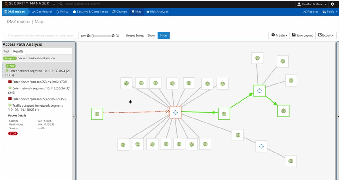 ÖÎÀíyuan¿ÉÒÔʹÓÃFiremon²úÎïµÄAPA¹¦Ð§£¬ÆÊÎöµ±Ç°ÍøÂç½á¹¹Ï£¬ÒÔ¼°·À»ðǽսÂÔÉèÖÃÏ£¬ÏµÍ³ÄÚµÄÁ½¸ö½Úµã¼äµÄij·þÎñÊÇ·ñ¿É´ï£¬²¢¸ø³ö¿É´ïµÄÏêϸ³ÂËߣ¬°üÂÞ·¾¶¡¢Í¨¹ýµÄ×°±¸¡¢Í¨¹ýµÄ·À»ðǽÉè±gaiüÖеÄÄÄÒ»ÌõÕ½ÂԵȵȡ£ÕâÑù£¬ÖÎÀíyuanÄܹ»Àû±ãµÄÏàʶËùÉèÖõÄijÌõÕ½ÂÔÊÇ·ñÉúЧ£¬»òÕßÊÇ·ñÐèÒªzeng¼ÓеÄÇå¾²Õ½ÂÔÀ´×èֹϵͳÄÚÁ½µã¼äµÄijÏî·þÎñ¡£