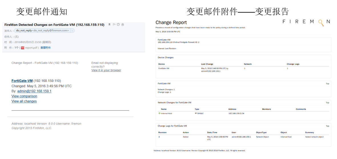 FireMon²úÎï»áʵʱ¼à¿Ø·À»ðǽ£¬µ±·À»ðǽµÄÉèÖûòÕßÇå¾²²ßÂyuan»±ä»»Ê±£¬Æ¾Ö¤ÉèÖ㬿ɷ¢ËÍemail֪ͨµ½Ö¸¶¨ÈËyuan»òÕß·¢ËÍsyslogµ½log·þÎñÆ÷¡£